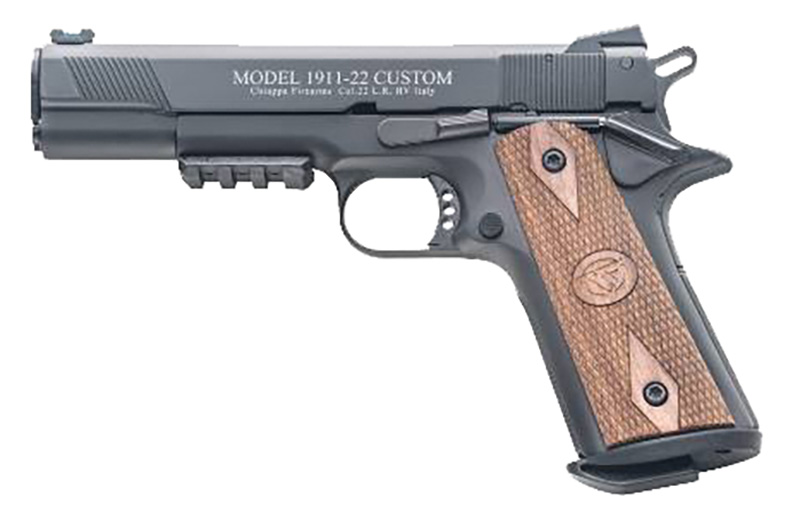 Chiappa Firearms, MFG# 401.101, UPC: 8053670710092, UOM: EA, 1911-22, 22 LR, 5″ Barrel, Fiber Optic Sights, Walnut Grips, Black, 2 10-rd Mags, CHIF, CHIFHG10, CHIFHGALL, HG10, HGALL