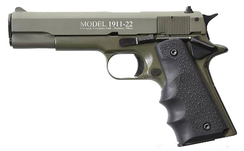 Chiappa Firearms, MFG# 401.121, UPC: 8053670716605, UOM: EA, 1911-22, 22 LR, 5″ Barrel, Fixed Sights, Hogue Grips, ODG, 2 10-rd Mags, CHIF, CHIFHG10, CHIFHGALL, HG10, HGALL