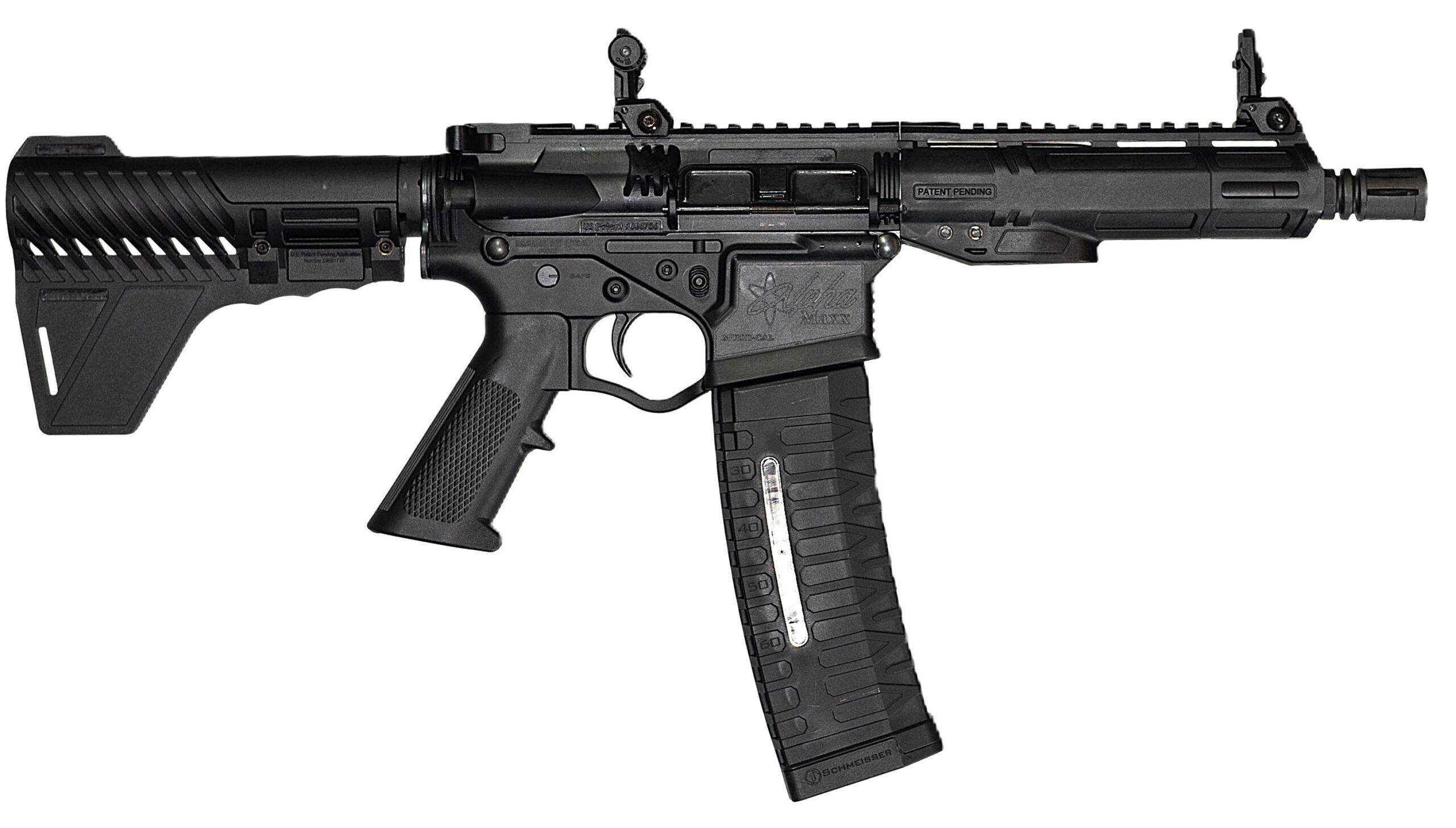 ATI ALPHA MAXX PISTOL IN 5.56X45MM WITH A 7.5 BARREL AND 7 MLOK RAIL WITH 60RD S60 MAGAGAZINE FLIP UP SITES AND REAR FIN