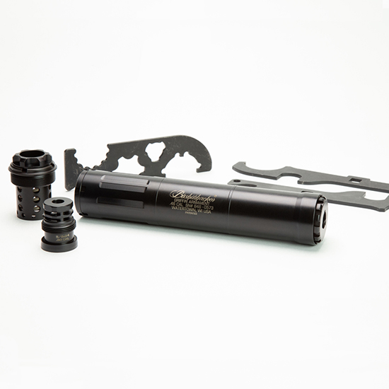 The Bushwhacker 46 was engineered to maximize and exceed the desired features utility and value for anyone seeking a universal sound suppressor. It’s performance features and available accessory options make it the best multi-caliber suppressor on the market and fits the role of the straight case hunter with big bore cartridges as well as 45 or 9mm pistol can and 30 cal. It’s a jack of all trades and the best performing silencer we’ve ever tested on a 45acp pistol. – The .46 caliber diameter provides end users with the most caliber flexibility possible while retaining quality sound suppression. .450 Bushmaster .458 socom .45-70 Govt and other large bore calibers are at home with the Bushwhacker 46. The .30 caliber Paladin blast shield front cap can be interfaced with the Bushwhacker 46 further improving sound performance on the Paladin with 30 caliber and lesser rounds like .308 Win .300 BLK and 6.5 Creedmoor. – Features: – Patented Ratchet-LOK end cap systemfor user serviceability – Patented HEDP baffles (High efficiency dual purpose) – Compatible with Griffin Taper Mount minimalist devices and TM Hammer Comp with included Plan-A and all Griffin Taper Mounts with the Plan-A XL – 1.375×24 threaded rear interface to support alternative mounting options – Supports 3-lug QD kit in 9mm and 10mm/.45 via 1.375×24 Booster piston housing – Supports rifle calibers from .22 up to 45-70 Govt. – Supports Pistol calibers up to .45 ACP – Use of 30 cal Paladin blast shield end cap increases sound performance on 30 caliber and lesser. – Specs: – 8.25 long x 1.5 diameter – 17-4 Stainless Steel tube body and front cap Black nitride finish – 6AL4V Titanium baffles – 16.3 oz in the Taper Mount configuration (using the included Plan A) – 18.1oz in the Pistol configuration – Barrel Length Ratings: 16-.45-70 .450 Bushmaster .458 SOCOM; 9.5-5.56; 6 .300BLK; 8 6.8 SPC 7.62×39; 12.5 .308Win; 20 .300WM; 24 .300RUM/.338LM